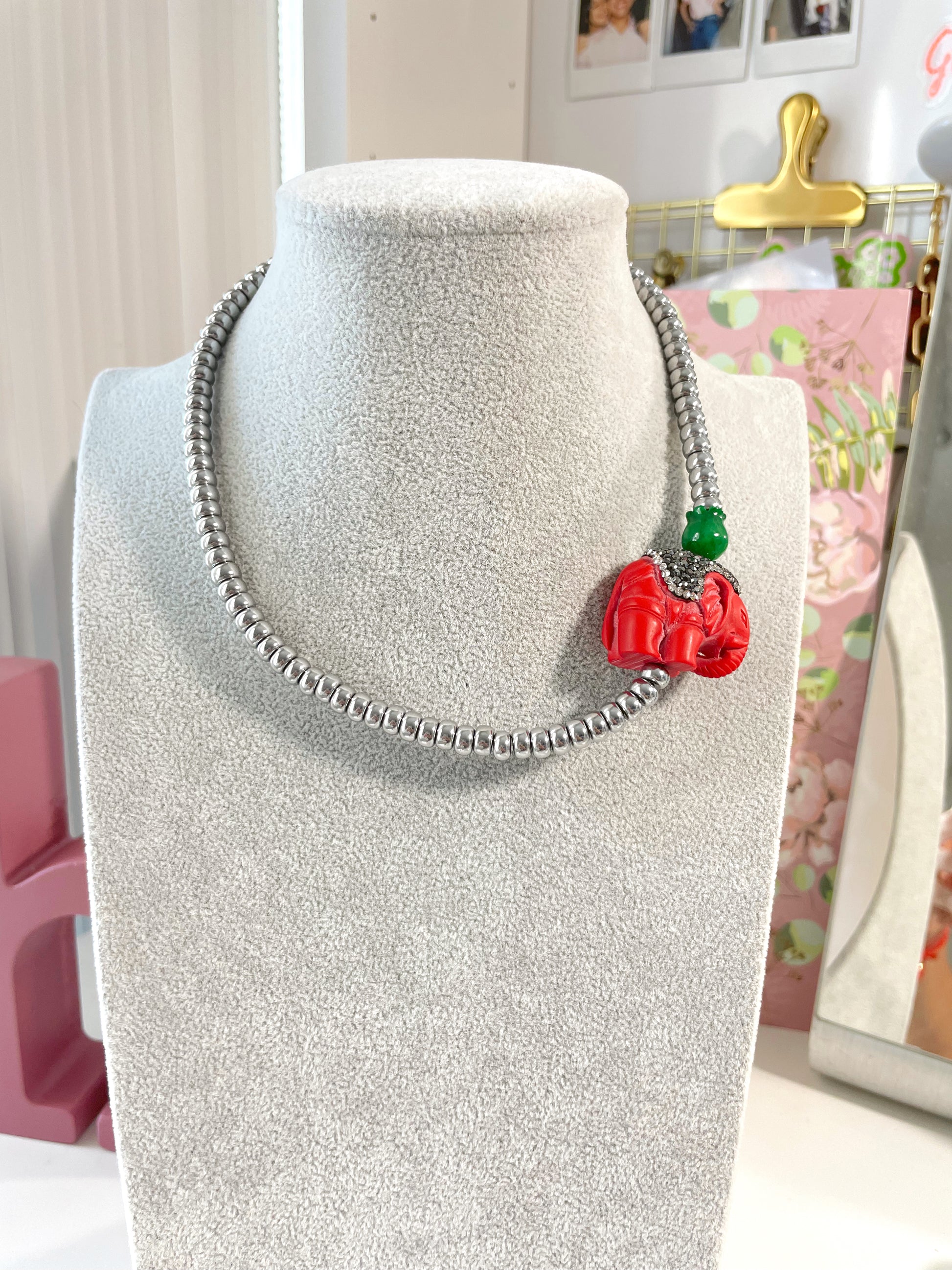 Collar Plateado con elefante y Jade