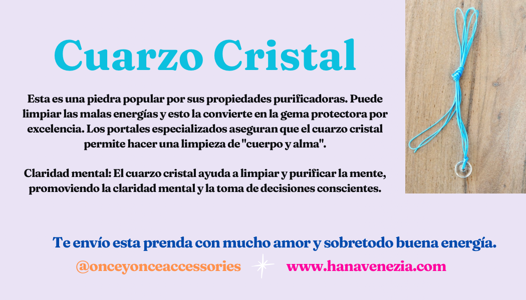 Cuarzo Cristal: Símbolo de fuerza, pureza, nobleza e inocencia, el cuarzo Cristal se utiliza para meditar y hacer limpiezas espirituales del cuerpo, alma y mente, ya que ayuda a equilibrar las energías.