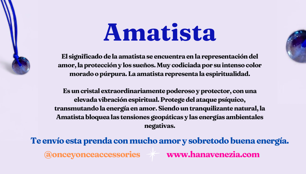 Amatista: es una piedra que transmite energía positiva, por lo que una ayuda a la calma, la meditación, el equilibrio emocional y la relajación.